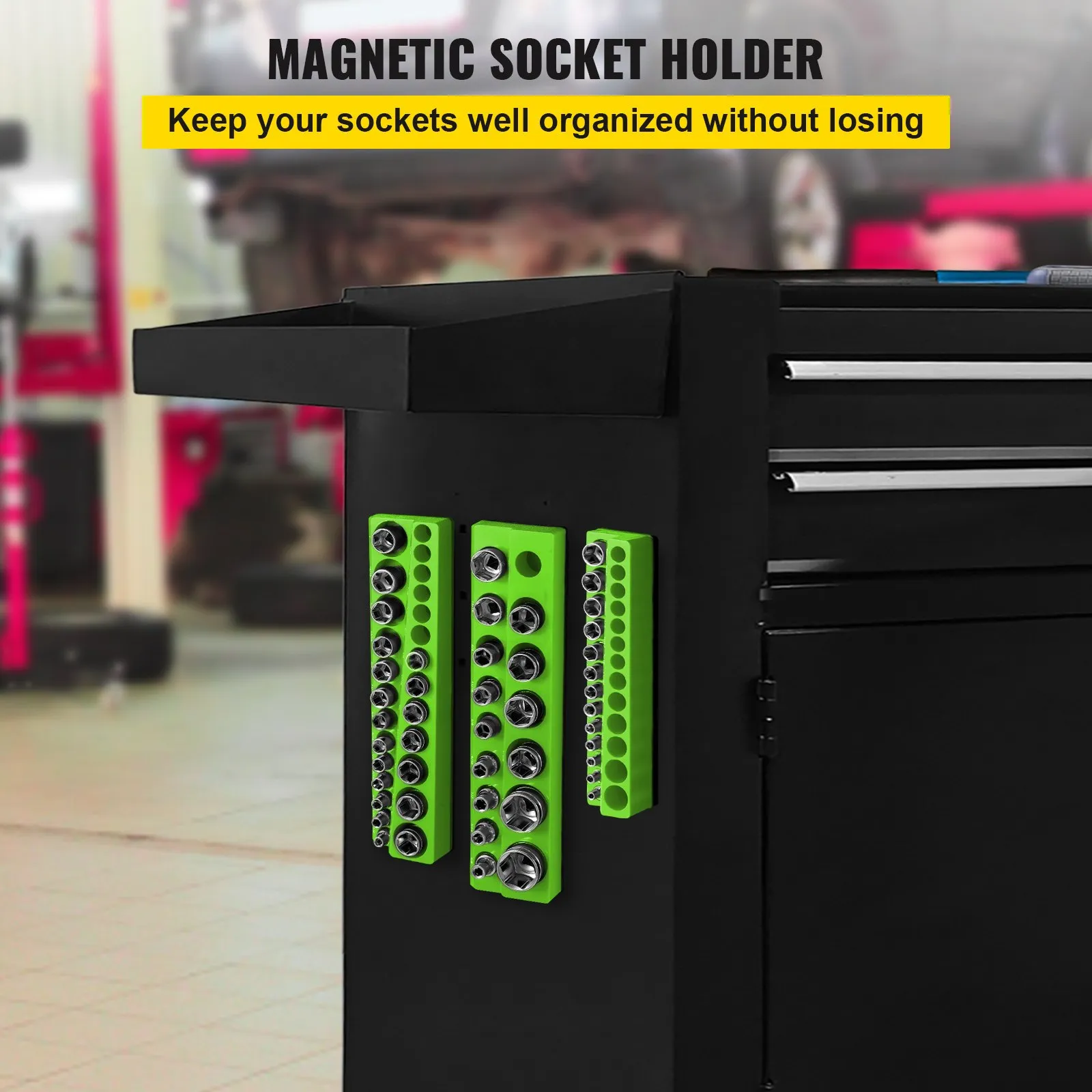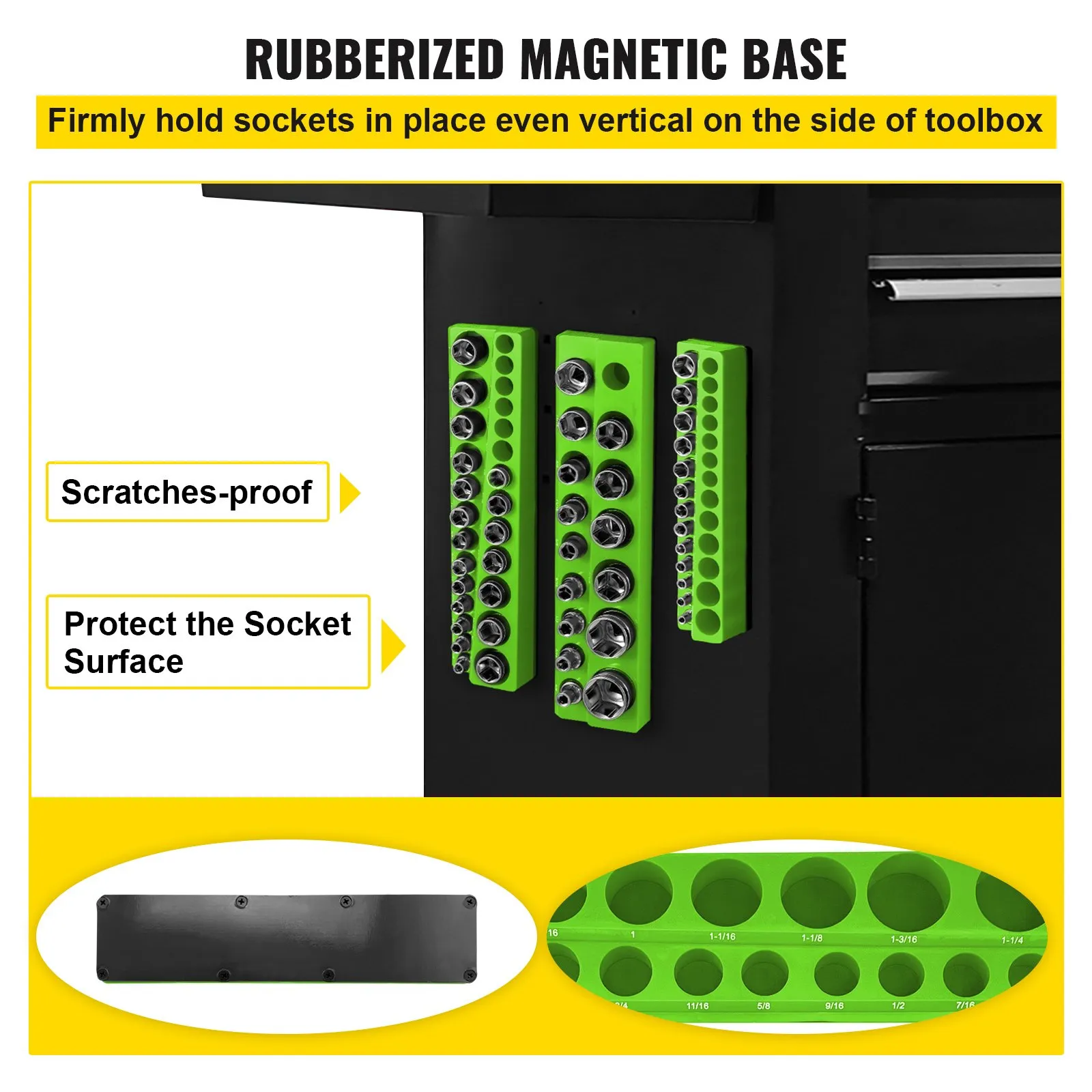 ✅ Powerful Rubberized Magnetic Base: Non-scratching on metal surfaces;mount vertically/horizontally on toolboxes or steel walls.Strong magnet secures sockets in place.