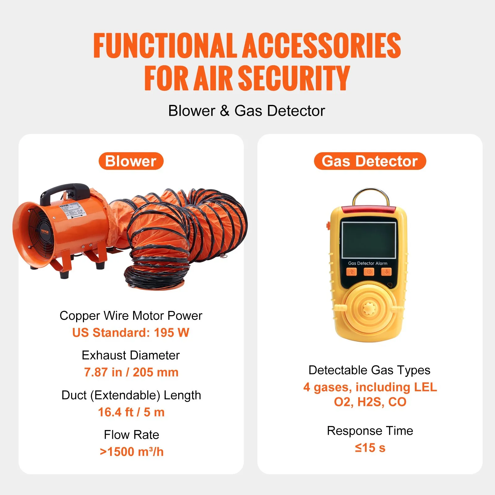 ✅ Ventilation & Gas Monitoring: Equipped with a copper-motor blower (205 mm vent, 5 m duct, 1500 m³/h airflow) and a 4-gas detector (LEL, O₂, H₂S, CO, response time ≤15s).