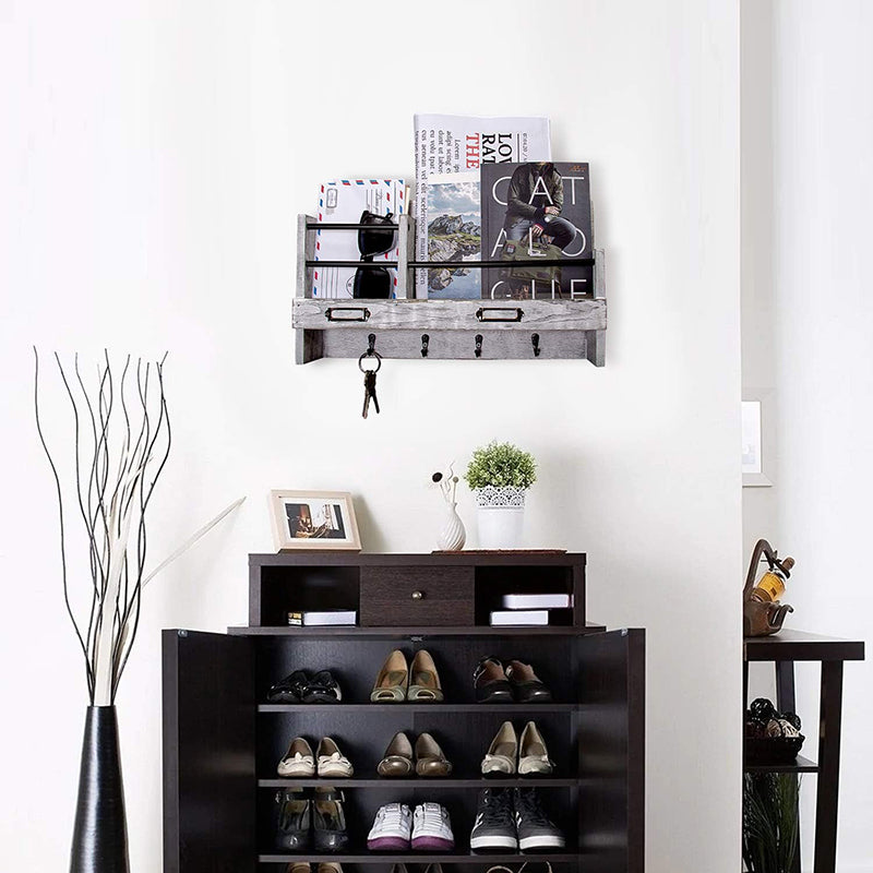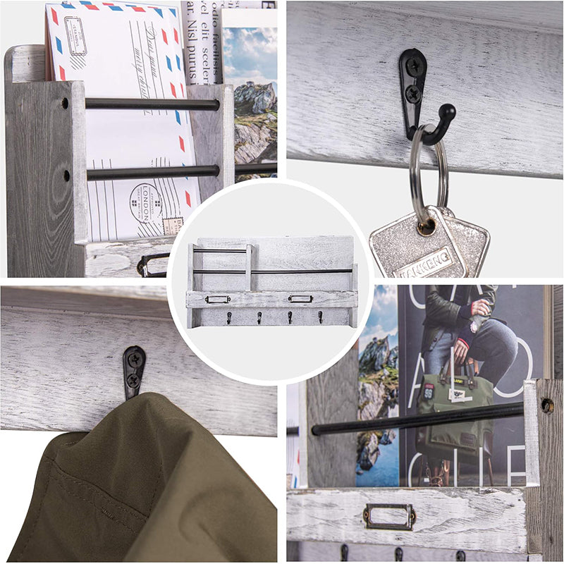 BNIB-Wall Mounted Mail Holder with 4 Key Hooks for Coat, Key Entryway Organizer(Gray)