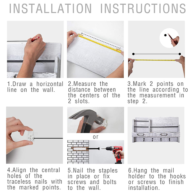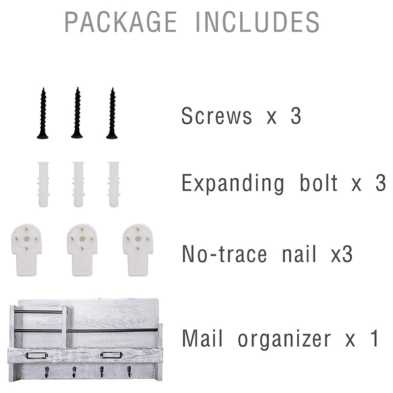 - Contents: 3 traceless nails, 3 screws, 3 bolts, and 1 mail holder.
