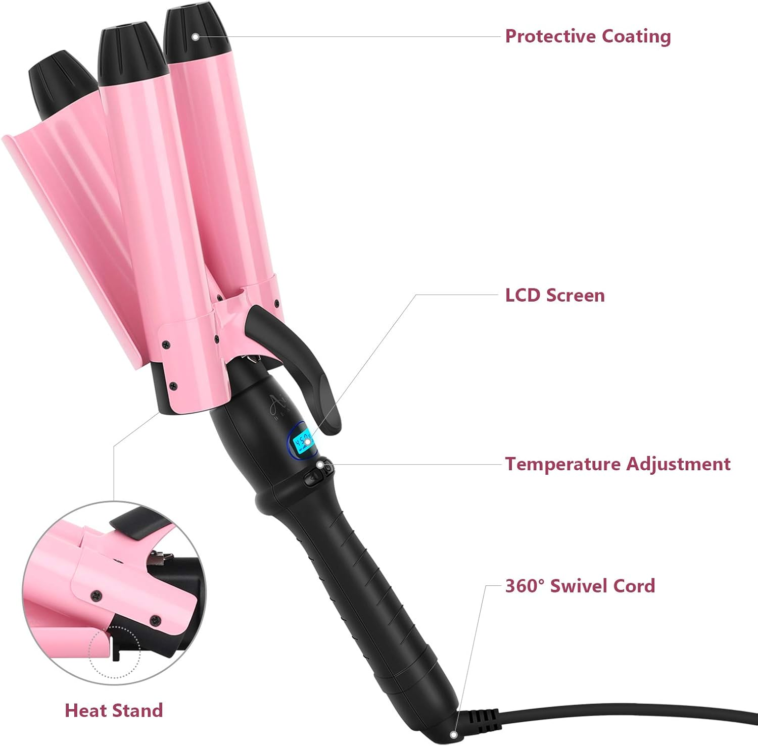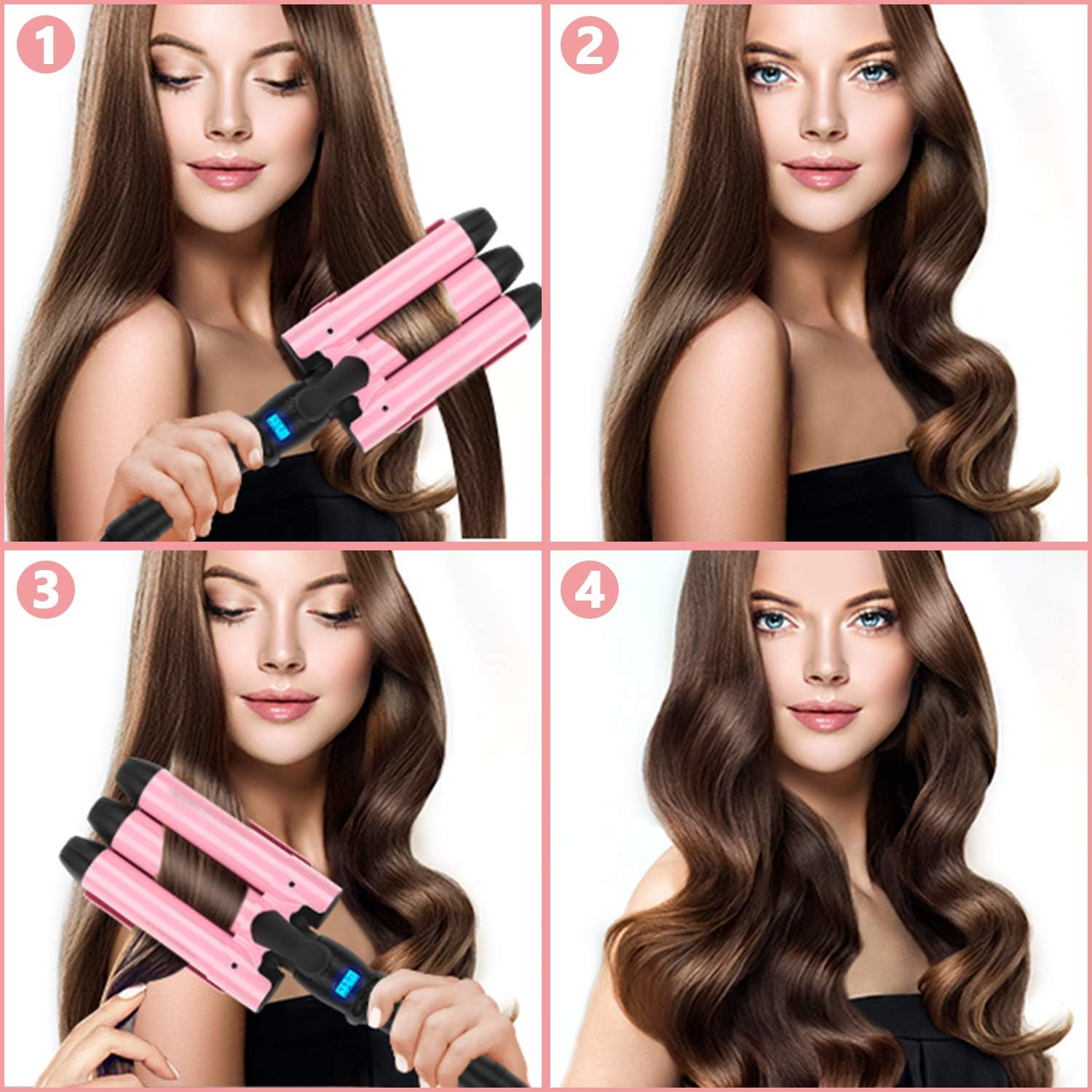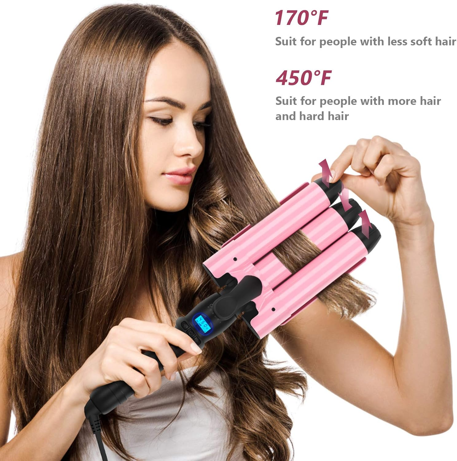 - LCD digital display 176-410°F( 80-210'℃ )adjustable,fit for harden hair ,moderate hair or soft hair, this triple ceramic curling wand makes it possible for you to choose the correct temperature for your hair type, letting you enjoy a silky, cute, stylish and professional result.