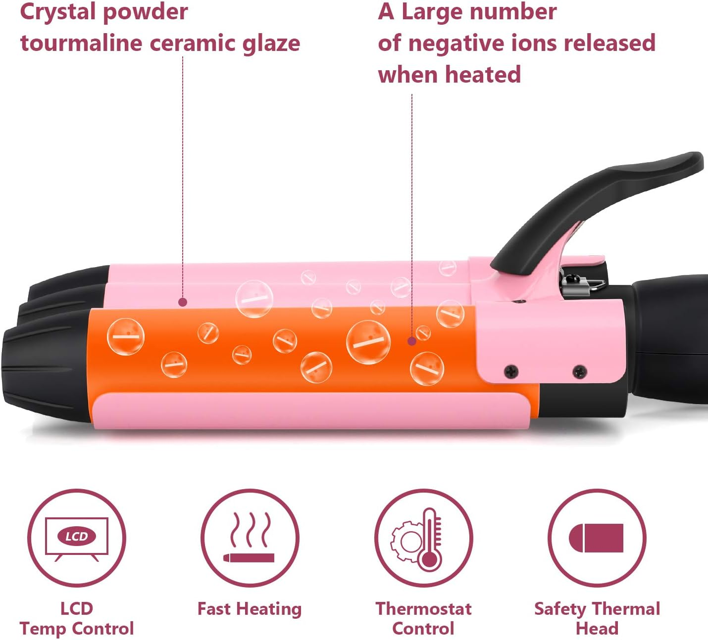 - With PTC Ceramic Glaze Heating Element, this curling iron can heat up in 60 seconds for smooth and quick curling.It curls your hair faster in just a few minutes than those single barrel styling irons that take ages to curl hair.