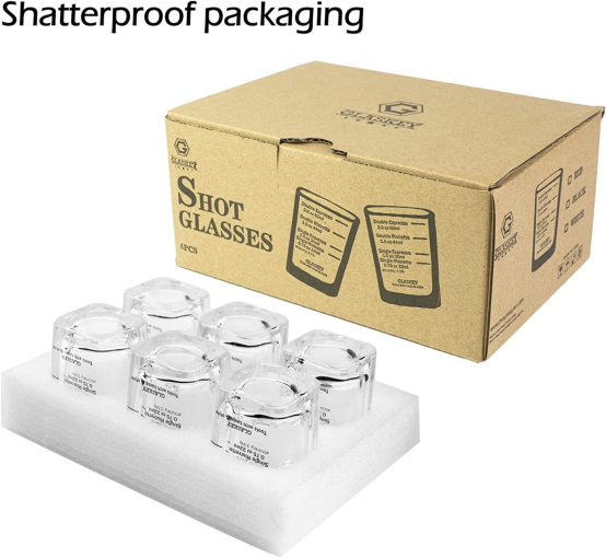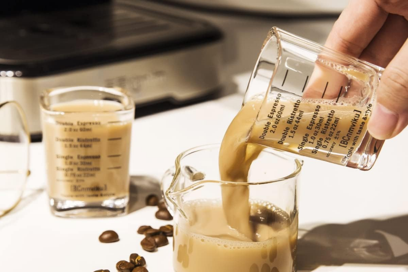 - Espresso cups are made of thickened glass. The glass measuring cup weighs 131 grams and has a wall thickness of 3 millimeters. Even if it lands on a hardwood floor, it won't be damaged.