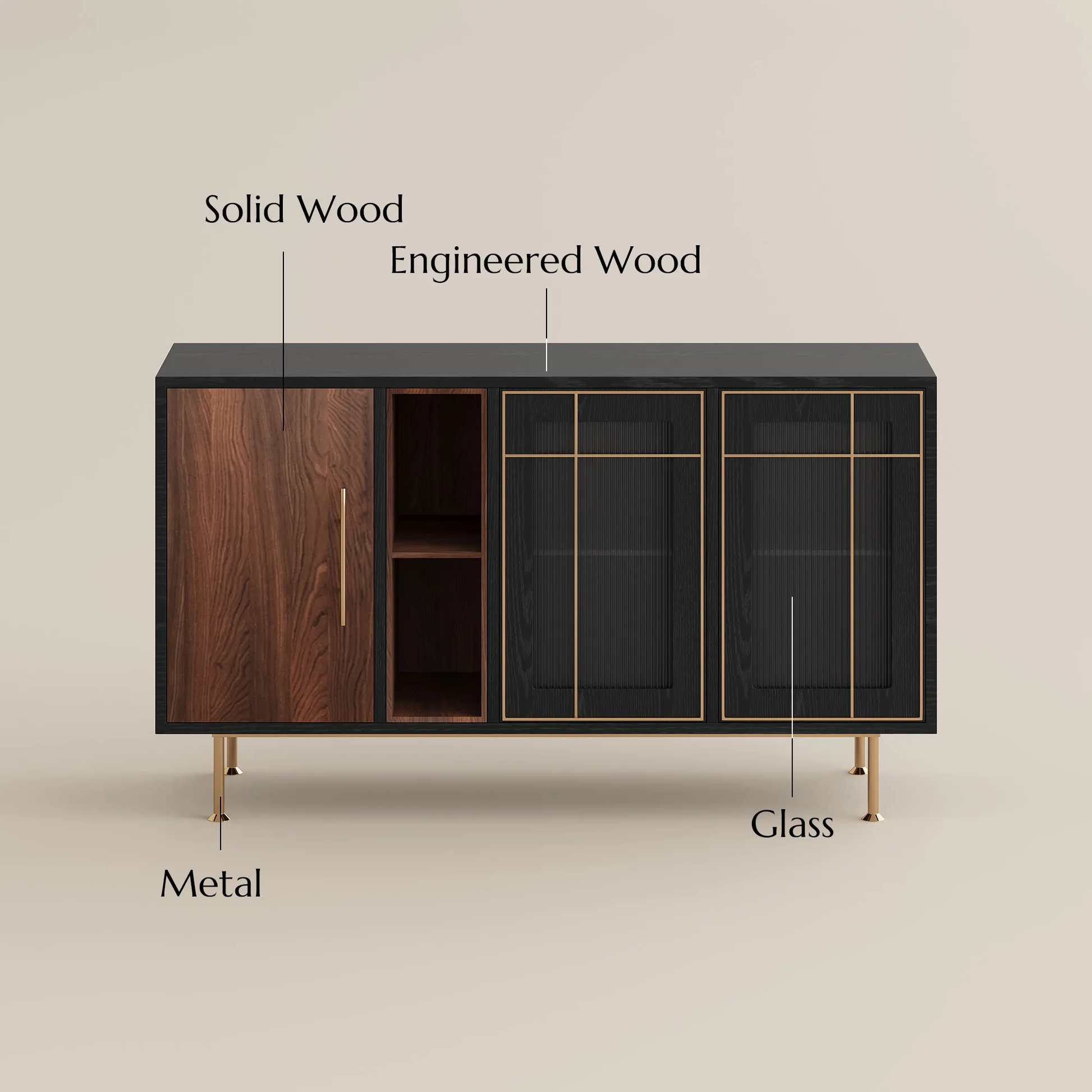 Mid-Century Modern Aesthetic: Timeless walnut wood grain, sleek black frame, and elegant gold accents on legs and glass grids, blending vintage charm with contemporary luxury