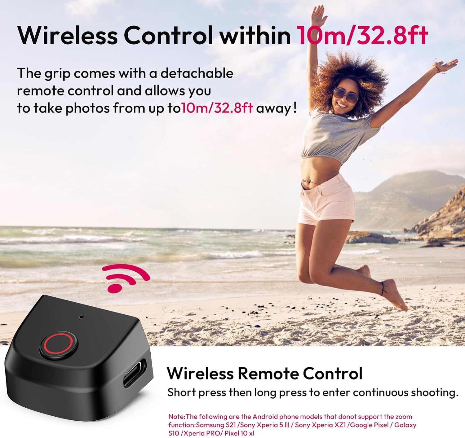 ✅ Detachable Wireless Remote: 49.2ft/15m remote control (iOS/Android compatible) connects without apps—easy for selfies, group photos, or hands-free shooting.
