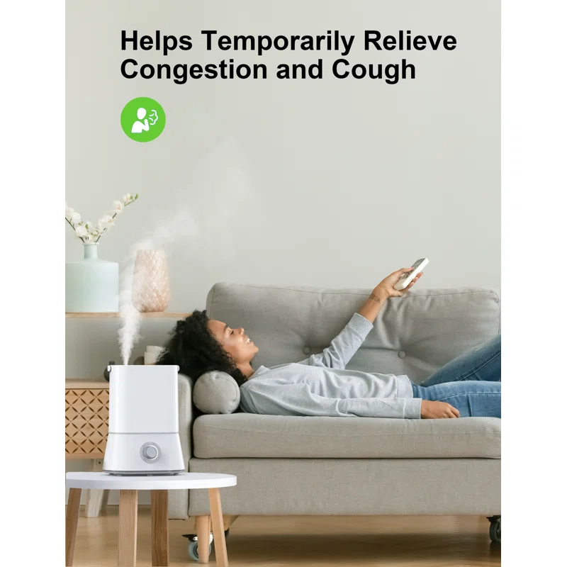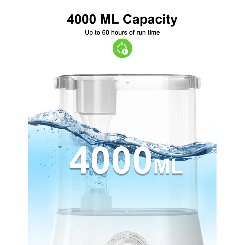 - 4L Tank & Adjustable Mist: 1.06 gallons of water lasts 12-50 hours; humidifies rooms up to 20-40 m² / 215-430 ft².