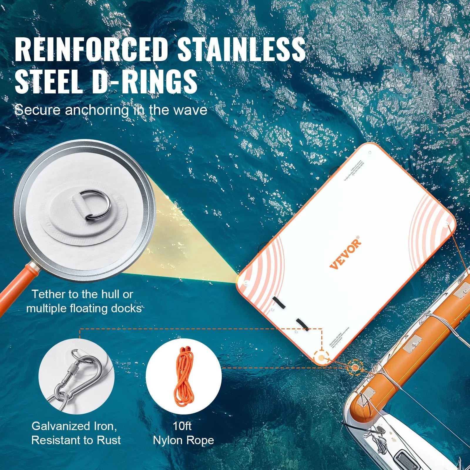 ✅ Secure Anchoring: Equipped with 6 stainless steel D-rings, 4 galvanized iron hooks (corrosion-resistant), and 10-foot nylon rope—keeps dock steady in water.