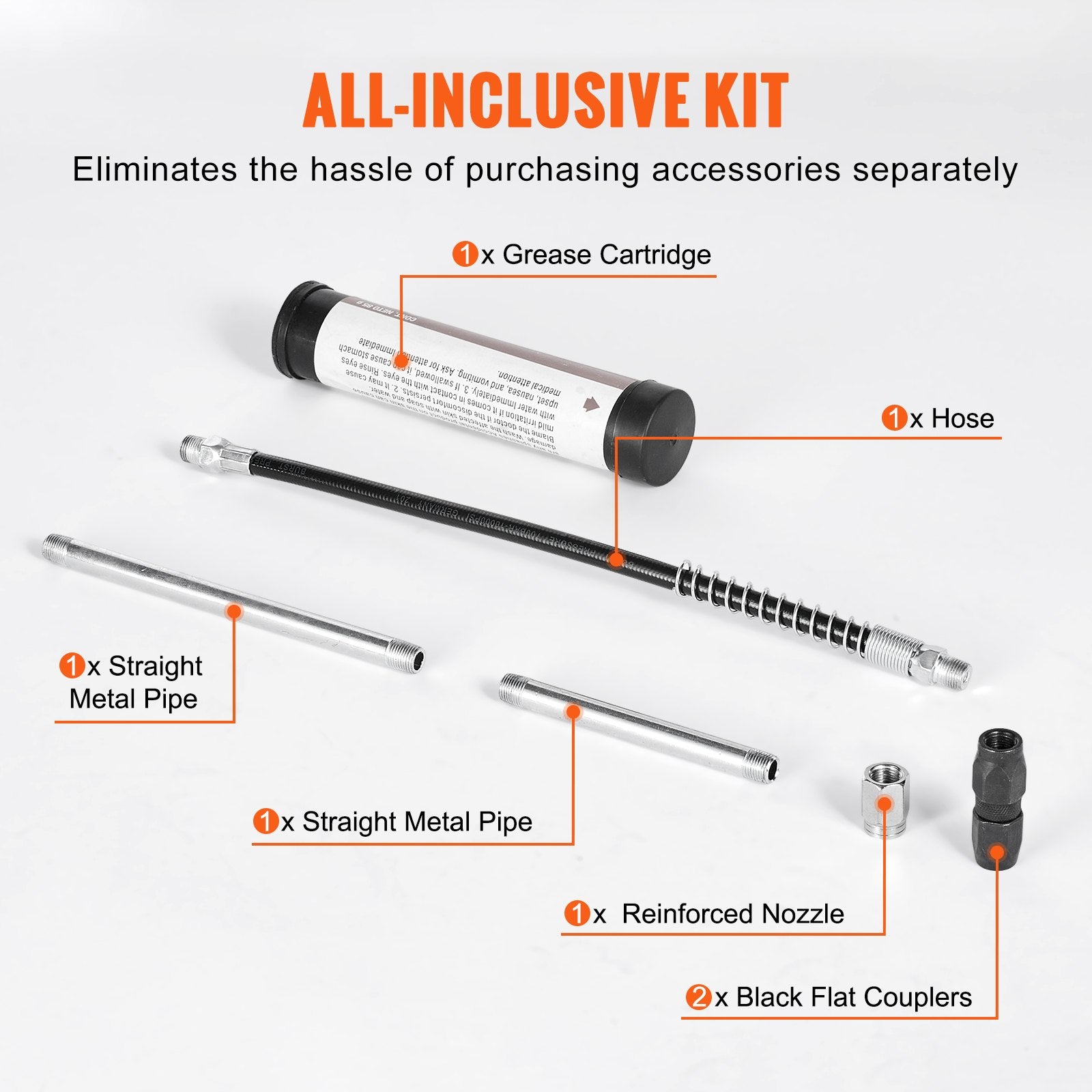 ✅Multi-purpose Accessories: Includes hose, 2 black flat couplers, 2 straight metal pipes, 1 reinforced nozzle, and 1 grease cartridge for all your lubrication needs.