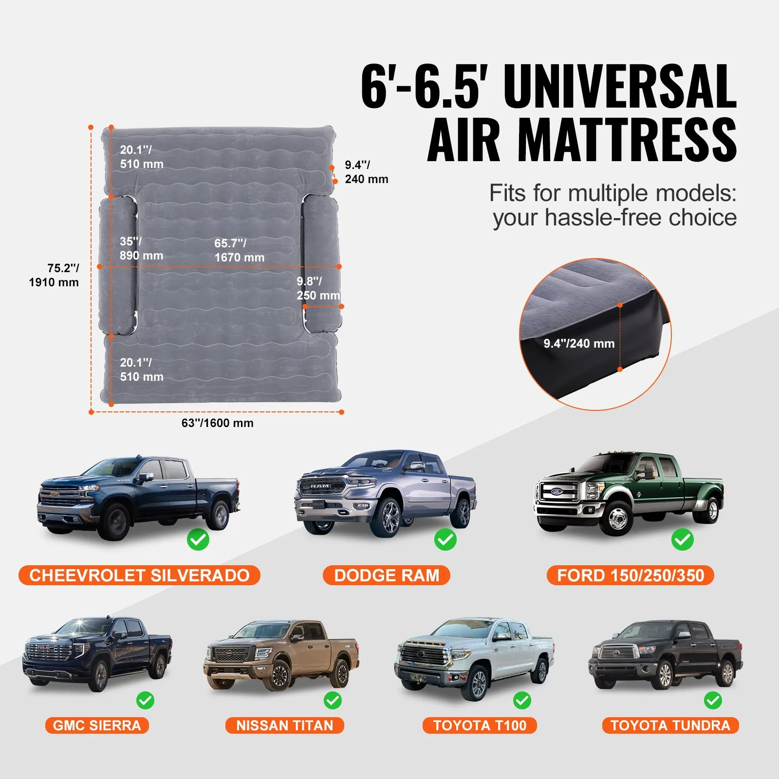 ✅ Versatile Compatibility: 1910x1600x240mm (fits 6-6.5ft trucks);works with Chevrolet Silverado, Ford 150/250/350, etc.;suitable for indoor/outdoor camping, tent use .