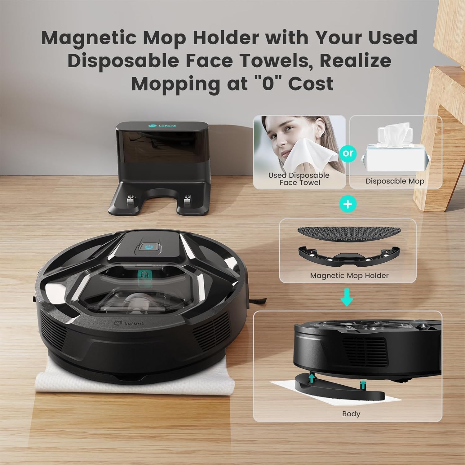 ✅ 3-in-1 Vacuum & Mop,Combines sweeping, vacuuming and mopping. Magnetic honeycomb mop holder holds disposable dry/wet wipes (water tank not included).