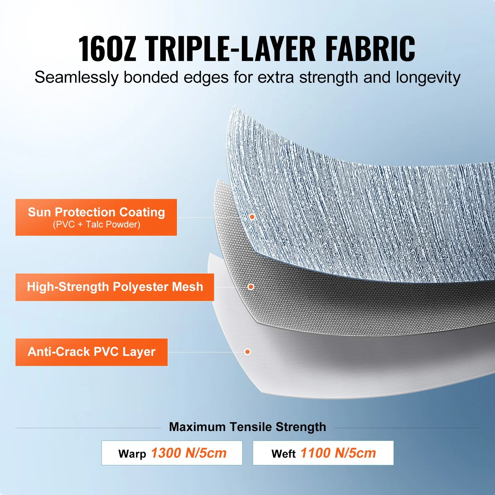 ✅ Durable 16oz Triple-Layer PVC – Outer PVC-talc layer (sun protection), middle high-strength polyester mesh (durability), inner PVC coating; fade-resistant, easy to clean, breathable, mildew-proof, and machine-washable.